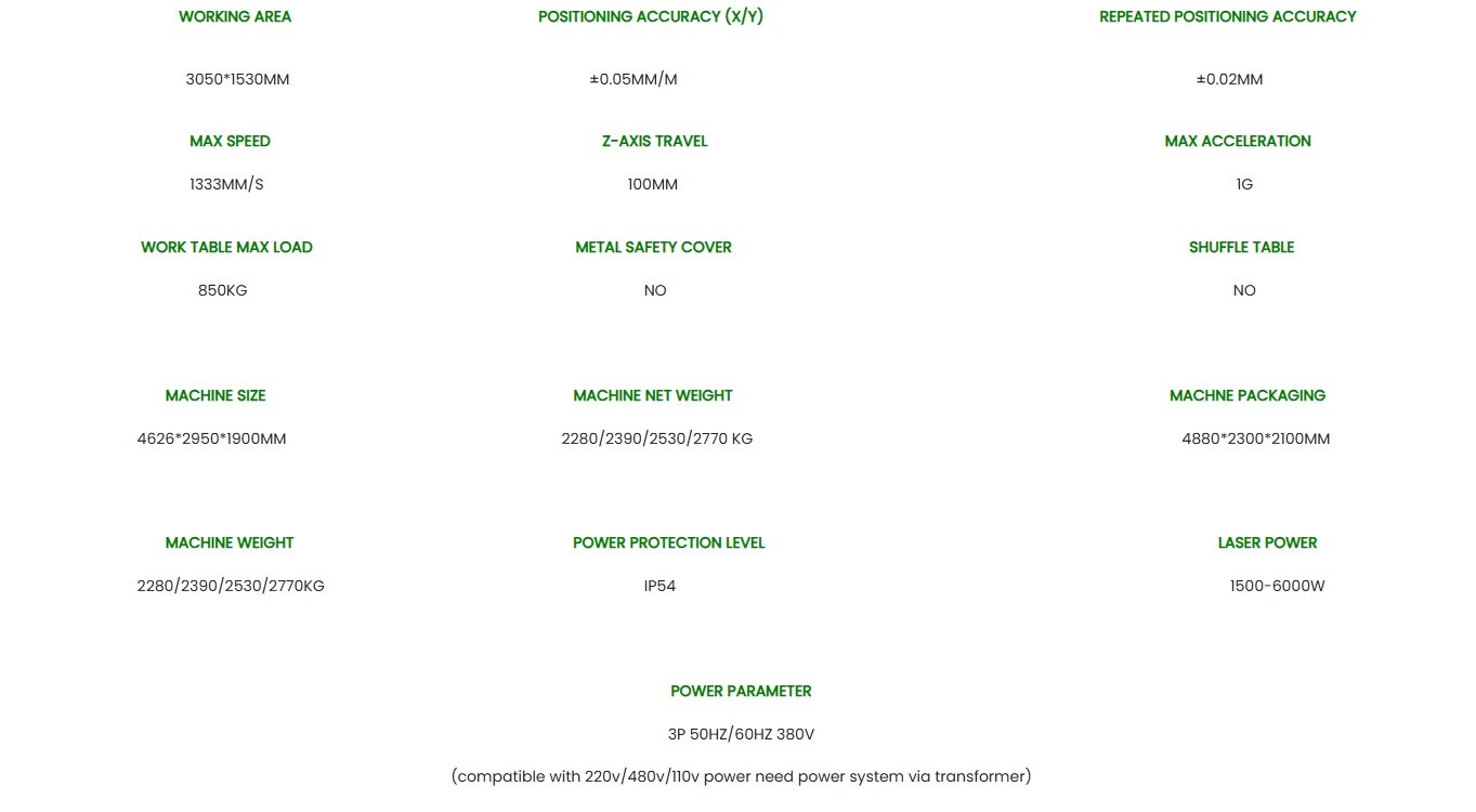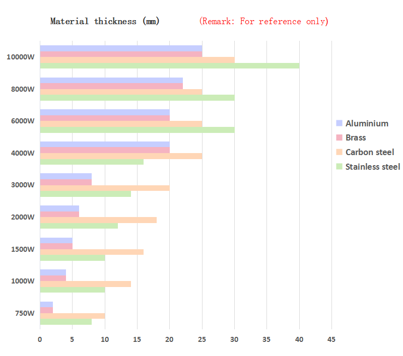 Laser power can vary from 1.5 to 4 kW depending on the thickness and quality of the material to be cut.